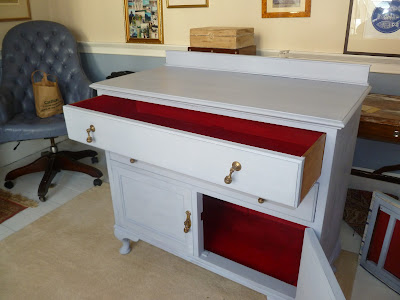 The outside is painted in Annie Sloan Louis Blue and the inside is Annie Sloan Emperor's Silk. Perhaps the nicest feature is the Art Nouveau brass handles. I know I have a close up picture somewhere, so will post it when it emerges.